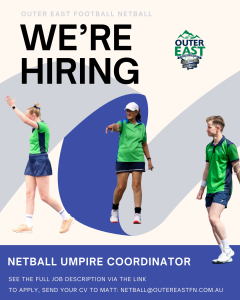 We’re looking for someone to enrich netball umpiring standards and numbers across all netball grades in the Outer East Football Netball competition.